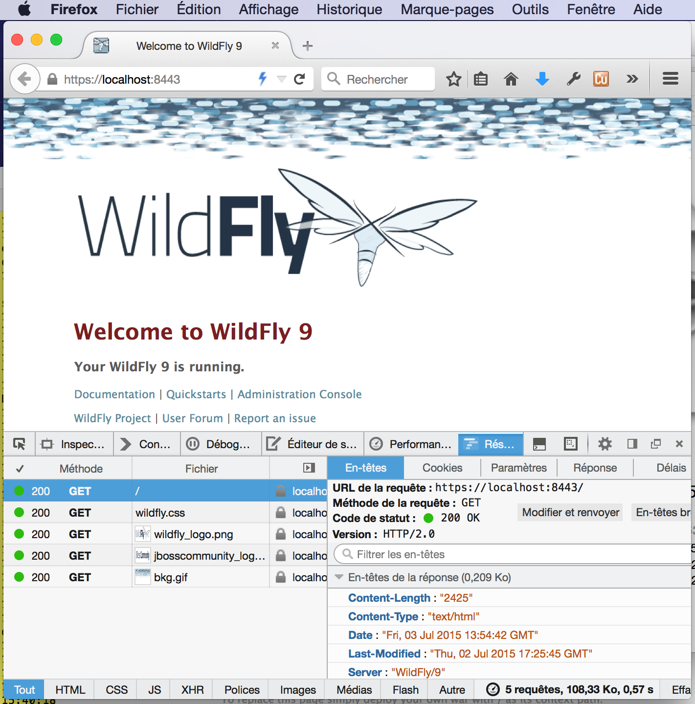 After a very quick JBoss startup (about 3s), you can check the welcome page with your favorite browser like Firefox. I use to check HTTP/2 protocol, the network panel available inside Firefox. This panel will show you the protocol version being used for each request.